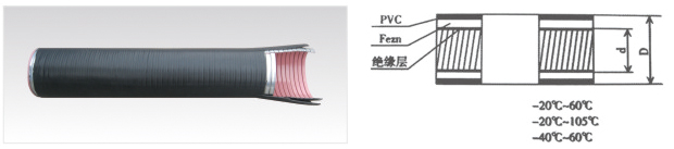 產(chǎn)品結(jié)構(gòu):KVZ阻燃型可撓(金屬)電氣導(dǎo)管,用特殊方法在kz基本型可撓(金屬)電氣導(dǎo)管表面,包覆一層具有良好柔韌性,軟質(zhì)阻燃聚氯乙烯(PVC)氧指數(shù)為31.6(標(biāo)準(zhǔn)要求達(dá)到26)。