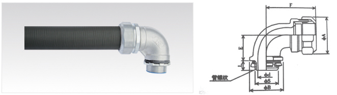 1、W90AG防水型90°彎角混合連接器與KV防水型、KVZ阻燃型可撓金屬電氣導(dǎo)管用螺紋方式連接,另一端與接線箱、電機(jī)等直角連接。